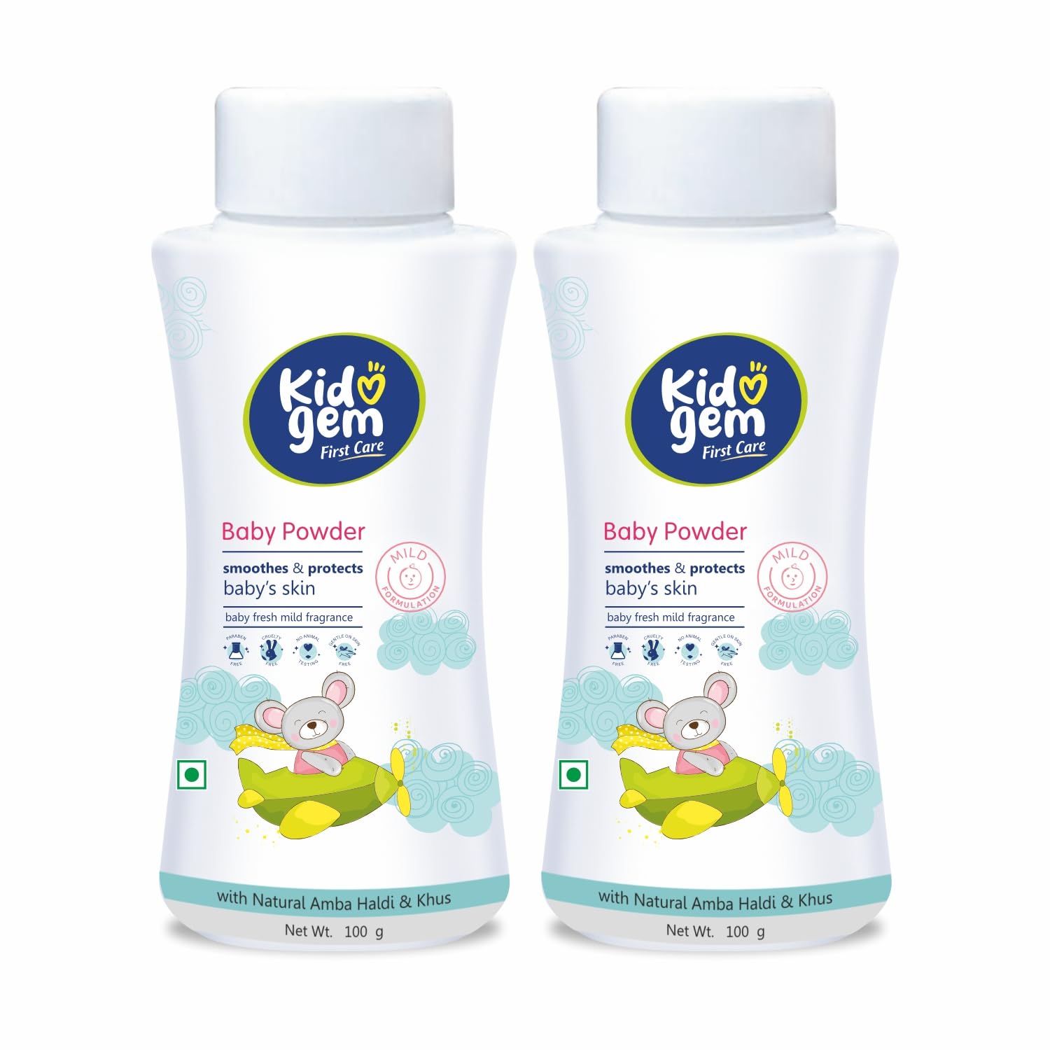 Kidogem Baby Powder, 100g Each (Pack of 2) – Talc-Free, Natural Formula with Amba Haldi & Almond Oil | Baby Powder for Face, Skin & Body |Soothes & Protects Diaper Rashes| for Newborns & Kids