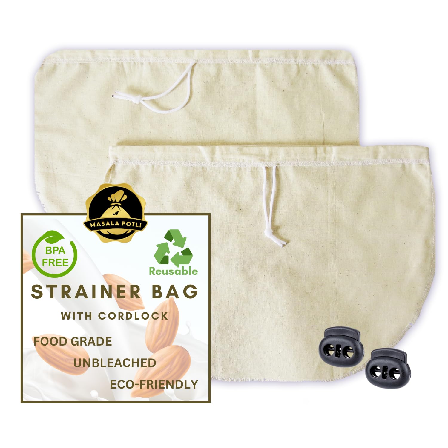 MASALA POTLI UNBLEACHED STANDARD SIZE COTTON RICE, YOGURT, NUT MILK, CHEESE STRAINER CLOTH BAG FOR SMALL FAMILY HOME USE- PACK OF 2