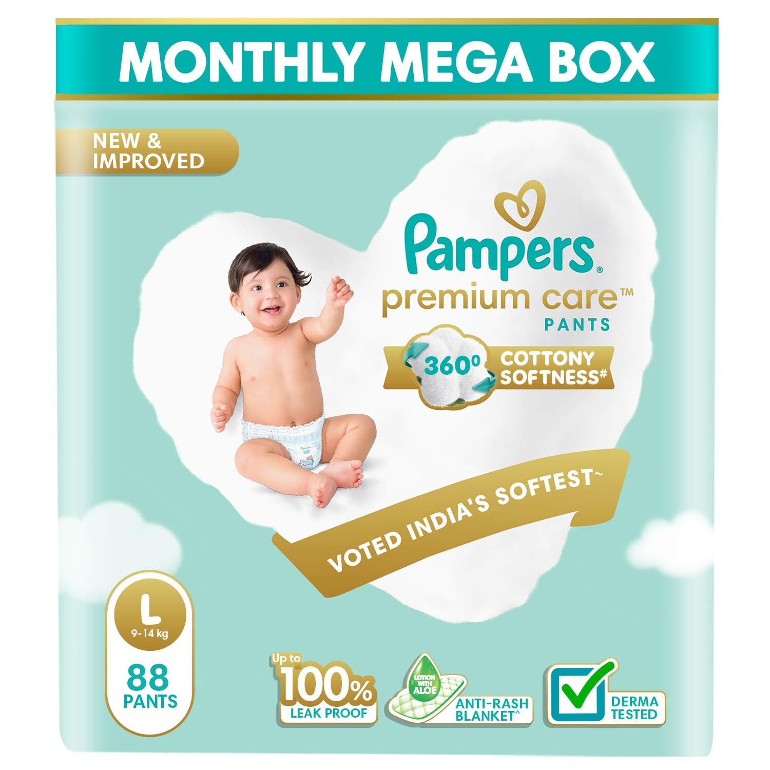 New Pampers Premium Care Pants with 360 degree cottony softness that provides your baby with all-round comfort;Contains lotion with Aloe Vera to protect your baby’s delicate skin from rashes