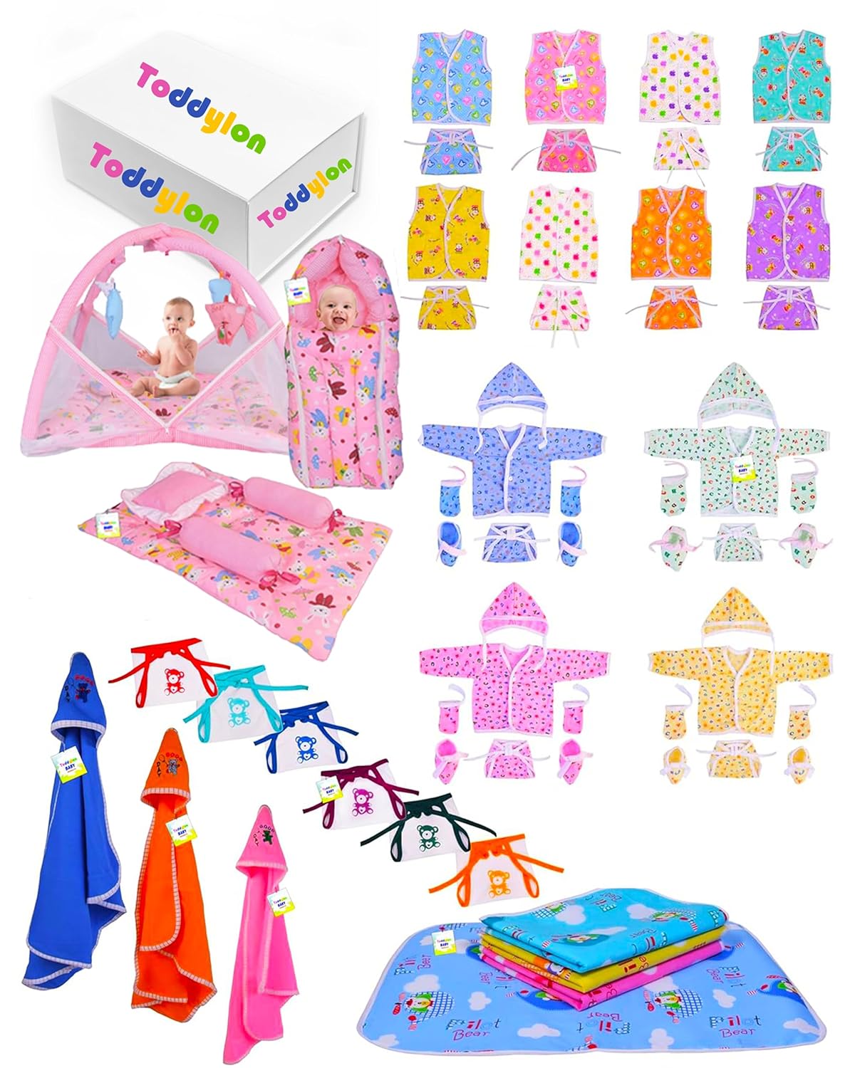 Toddylon New Born Baby Gift Combo Daily Essential Bedding And Clothing Set Pack Of 56 Items For 0-6 Months Babies